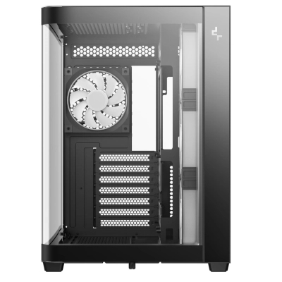Корпус постачається з чотирма вентиляторами ARGB: три вентилятори із зворотними лопатями встановлені на бічній панелі та один стандартний вентилятор – на задній панелі. Конфігурація зі збалансованим впуском та випуском повітря забезпечує інтенсивний повітряний потік та ефективне охолодження без додаткового налаштування.