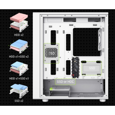 Зручність у зберіганні даних гарантується підтримкою широкого вибору конфігурацій накопичувачів: до трьох 3.5-дюймових жорстких дисків та п'яти 2.5-дюймових SSD. Корпус дозволяє користувачам організувати систему зберігання даних відповідно до своїх потреб, забезпечуючи таким чином максимальну гнучкість та ефективність.