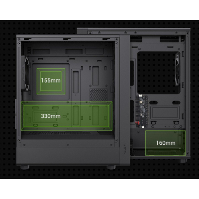 Спробуйте поєднання універсальної підтримки обладнання з можливістю встановлення 330-мм відеокарт, 160-мм блоків живлення ATX, а також 155-мм повітряних кулерів, що дозволяє виконати найвибагливіші завдання чи побудувати ідеальну ігрову систему. Широкий спектр охолоджувальних можливостей включає верхні 240-мм та передні 360-мм радіатори.