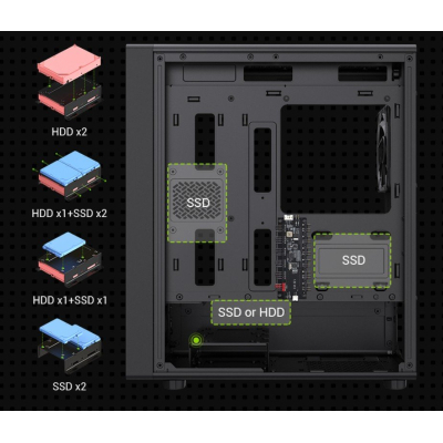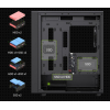 Особлива увага приділена розташуванню компонентів. Без блоку живлення – це можливість вибору найкращого варіанту саме для ваших потреб, а його нижнє розташування сприяє кращому розподілу ваги і впровадженню органічного кабельного менеджменту. Корпус пропонує 3 внутрішні відсіки 3.5" та цілі 5 для 2.5" накопичувачів, допомагаючи гнучко підлаштовувати конфігурацію зберігання даних.
