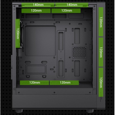 Ефективність охолодження – частина, на яку розробники звернули особливу увагу. Передня панель з Airflow-Mesh конструкцією забезпечує чудовий повітряний потік, а реалізовані отвори для прокладення кабелів та інші особливості гарантують максимальну швидкість тепловіддачі. Підтримка рідинного охолодження та можливість встановлення до 8 120-мм вентиляторів (з чотирма встановленими ARGB/PWM) забезпечують чудовий контроль температур навіть під час найінтенсивніших навантажень.