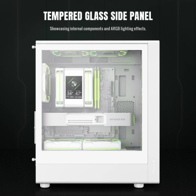 Система охолодження в цьому корпусі заслуговує на окрему увагу. Завдяки передній сітчастій панелі з високим коефіцієнтом повітряного потоку та вертикальному розташуванню компонентів, теплове розсіювання значно оптимізовано. У корпусі можна розміщувати до восьми 120-мм вентиляторів, чотири з яких вже встановлені як 120-мм ARGB/PWM вентилятори. Це дає змогу організувати синхронізоване освітлення та оптимізувати повітряний потік у всій системі.