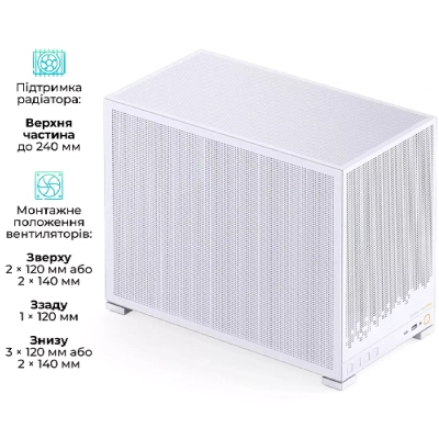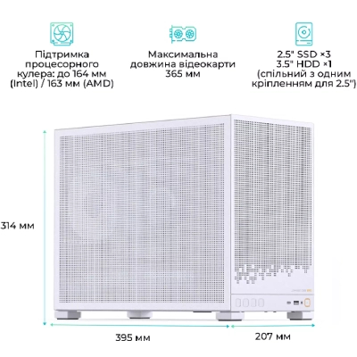 Мультимедійні, Minitower, Micro - ATX, Mini - ITX, Слотів розширення - 4, Додатково - Back 1x12 см, Bottom 3x12, 2x14 см, Top 2x12 or 1x14 см, GPU - 365 мм, CPU - 163 мм, PSU - 170 мм, білий