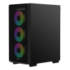 Чотири 120 мм ARGB вентилятори входять у комплект та створюють поєднання потужного повітряного потоку і сучасної візуальної стилістики. Динамічні світлові ефекти легко синхронізуються з материнською платою, дозволяючи сформувати єдину концепцію освітлення. Користувач може адаптувати вигляд системи під робочий настрій або ігровий стиль без лишніх зусиль — ефекти плавно відображаються через фронтальні перфоровані панелі та бічне оглядове вікно.