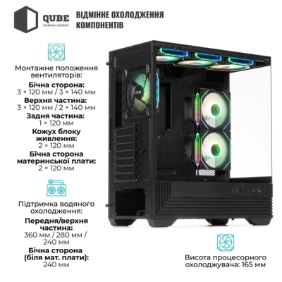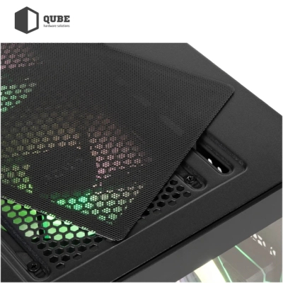 Qube FORT_GBNU3 підтримує інноваційні рішення для охолодження: повноцінну систему рідинного охолодження, додаткові вентиляційні отвори з пиловими фільтрами та Airflow-Mesh технології для безперешкодного потоку повітря. Це гарантує підтримку стабільної температури всередині при інтенсивному навантаженні, що особливо важливо для ентузіастів і оверклокерів.