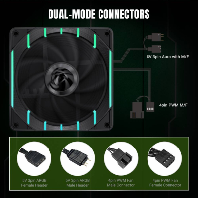 Кількість вентиляторів - 1, діаметр вентиляторів - 120 мм, тип підшипника - FDB Bearing (гідродинамічний), тип роз'єму підключення - 3-pin, 4-pin, Підсвітка - ARGB, рівень шуму - 32.12 дБ