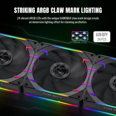 Приголомшливе ARGB-підсвічування: 24 ARGB-світлодіоди створюють унікальний ефект сліду кігтя GameMax. Підтримує синхронізоване регулювання підсвічування з материнською платою, додаючи естетики кіберспорту до вашого корпусу ПК.
