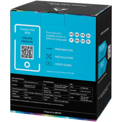 Arctic Freezer A35 RGB — високопродуктивний процесорний кулер оснащений яскравою RGB-підсвіткою. Призначений для охолодження процесора AMD під сокети AM5 та AM4. Для розсіювання тепла із радіатора використовується 120 мм вентилятор. Вентилятор має широкі лопаті, які здатні захопити велику кількість повітря. За одну хвилину виріб виконує до 1700 обертів. Підключається пристрій за допомогою конектора 4 Pin.