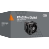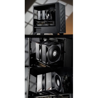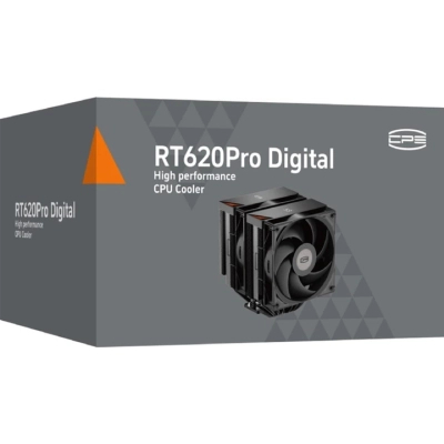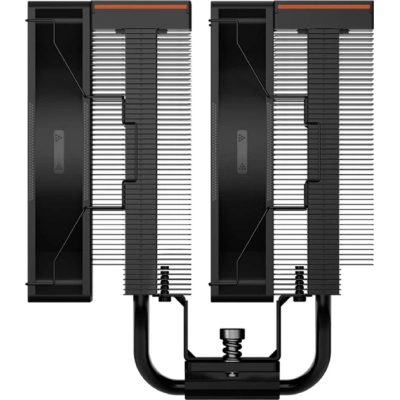 PcCOOLER чорного кольору з двома вентиляторами. Уніфікований трикутний візерунок оживив майже аскетичний дизайн. Теплові трубки працюють у будь-якому напрямку, горизонтально чи вертикально, без впливу сили тяжіння. Потужні, але тихі HB PWM чорні вентилятори високої якості з чітким математичним балансом між потоком повітря до 73.32 фут³/хв та тиском до 3.28 мм H2O, дозволяє досягти 265W потужності.