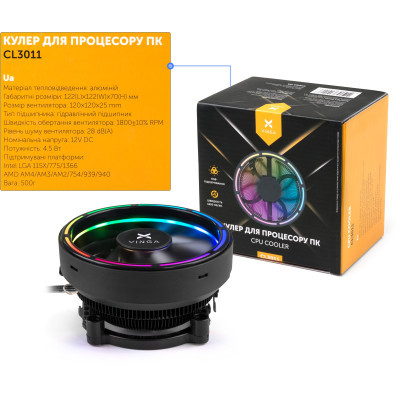 Vinga CL3011 — кулер на алюмінієвому радіаторі, розроблений для охолодження процесорів INTEL і AMD. Система підтримує розширений перелік сокетів — 13 найпоширеніших типів. Діаметр вентилятора становить 12 см. Завдяки цьому він може обертатися зі швидкістю 1800 об/хв. У такий спосіб, модель створює повітряний потік інтенсивністю 51 CFM. Водночас, рівень поширюваного нею під час роботи шуму досить невисокий — лише 28 dB.