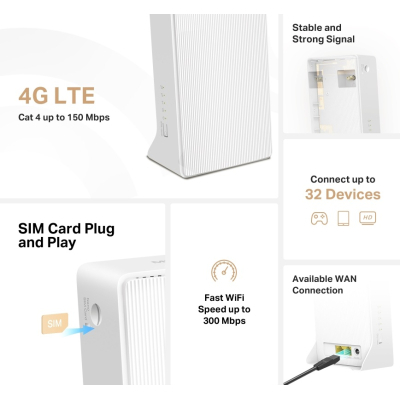 Маршрутизатор Mercusys MB110-4G — це ідеальне рішення для створення надійної бездротової мережі в вашому домі чи офісі. Підтримуючи технологію 4G/LTE, цей пристрій забезпечує швидкість Wi-Fi до 300 Мбіт/с на частоті 2.4 ГГц, що дозволяє безперебійно дивитися потокове відео, грати в онлайн-ігри та комфортно працювати в інтернеті.