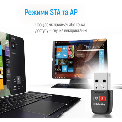ColorWay (CW-AD-W1) Wi-Fi 6 — компактний адаптер нового покоління для швидкого та стабільного підключення до бездротового Інтернету. Завдяки підтримці стандарту Wi-Fi 6 (802.11ax), адаптер забезпечує вищу ефективність, стабільність сигналу та підвищений рівень безпеки порівняно з попередніми поколіннями. Навіть у перевантажених мережах ви отримуєте плавний та надійний зв'язок.