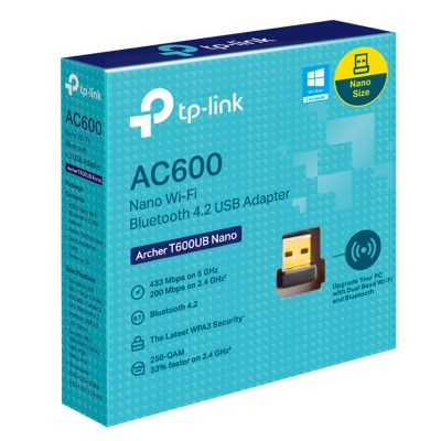 TP-LINK Archer T600UB Nano — це компактний USB-адаптер, що поєднує швидкісний Wi-Fi і Bluetooth 4.2 для ПК чи ноутбука. Завдяки підтримці AC600 він забезпечує до 200 Мбіт/с на частоті 2,4 ГГц і до 433 Мбіт/с на 5 ГГц, що робить перегляд контенту та обмін файлами швидким і зручним. Мініатюрний дизайн дозволяє залишати адаптер підключеним постійно, а сучасні протоколи шифрування гарантують захищеність з’єднання.