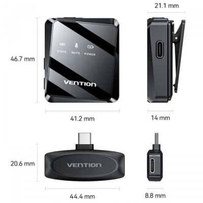Мікрофон Vention USB-C 2-Pack Wireless Lavalier Microphone підключається за допомогою бездротової технології передачі сигналу 2.4 ГГц через USB-C ключ та підтримує роботу на відстані до 50 м у середовищі без перешкод.