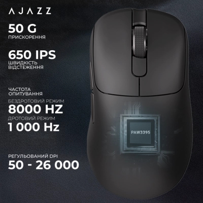 Миша Ajazz AJ179PRO оснащена високоточним сенсором PixArt PAW3395, що входить до числа найкращих у своєму класі. Максимальна роздільна здатність становить 26 000 DPI, забезпечуючи виняткову точність та швидкість. Завдяки високій швидкості відстеження до 750 IPS та прискоренню 50G, ця модель ідеально підходить для динамічних ігор, де важлива миттєва реакція.