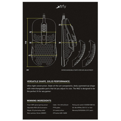 Надлегка конструкція. Сучасні компоненти. І симетрична форма зі змінними частинами, які дозволяють регулювати розмір миші. M42 ідеально підходить для будь-якого геймера.