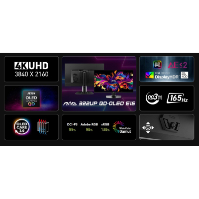 31.5", QD-OLED, 3840 x 2160, 165 Гц, 16:9, 1000 кд/м2, 450 кд/м2, 1 500 000:1, VESA - 100x100 мм, 7.7 кг