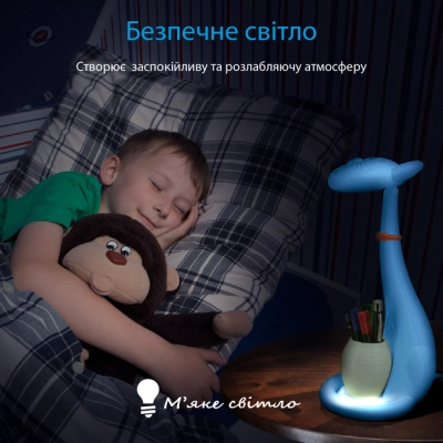 Цей світлодіодний настільний світильник може висвітлити будь-який темний простір у вашому будинку та дати відчуття безпеки вашій дитині. Світло, що випромінюється світлодіодними лампами, нейтральне й захищає дитячі очі від шкідливого впливу. Безпека перевірена й корпус виробу захищений від несанкціонованого доступу, щоб захистити маленькі пальчики. Легко змінювати інтенсивність, теплоту світіння натискаючи сенсорну кнопку на «оці тварини», так що ваша дитина матиме ідеальне світло для своїх занять, читання або відпочинку.