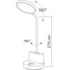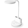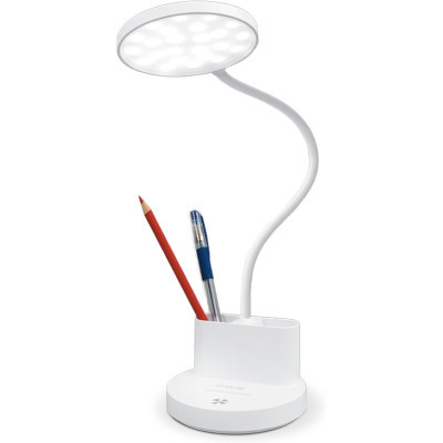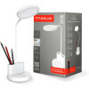 Світлодіодна настільна лампа з акумулятором TITANUM TLTF-011W – стильна та економічна з можливістю регулювання яскравості та колірності. Лампа абсолютно безшумна, компактна та має тривалий термін служби. Корпус виготовлений з екологічно безпечного високоякісного пластику білого кольору. Корпус лампи має декілька відділів для канцелярії, що дуже зручно, адже на робочому столі можна використовувати значно менше додаткових предметів. Пристосована для розміщення на робочому столі та призначена для його освітлення. Рухома конструкція лампи дозволяє скеровувати світло у потрібному напрямку. Реалізована можливість регулювання яскравості та зміни колірності світла, що сприяє зменшенню навантаження на органи зору в різних умовах та під час різних видів діяльності. Слугує також в якості підставки для смартфона, на корпусі для цього є спеціально відведене місце з бортиком.