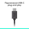 Підключення здійснюється через USB-C (Plug-and-Play, кабель 1.9 м), що сумісне з ПК, ноутбуками та планшетами (Windows, macOS, ChromeOS, Android, iOS). Регульоване наголов’я і поворотні амбушури зі шкірозамінника забезпечують комфорт при тривалому використанні, а вага 197 г не створює дискомфорту. Корпус із міцного пластику, частково з перероблених матеріалів, відповідає екологічним стандартам.