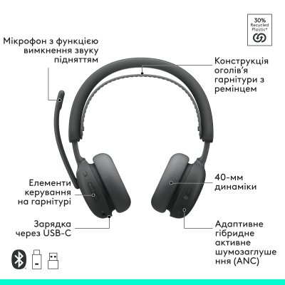VoIP телефонія та кол-центри, бездротове, USB Type-C, Bluetooth, радіоканал, закриті, Випромінювач - 40 мм, 36 Ом, чутливість - 97 дБ, 20 - 20000 Гц, Активне шумозаглушення - є, з мікрофоном, Версія Bluetooth - 5.3, 25 год, Black, 212 г
