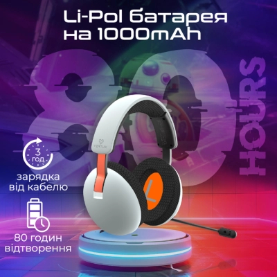 - Li-Pol батарея на 1000 мАг: Вистачить на 80 годин відтворення в режимі non-stop та 500 годин у режимі очікування.Зарядити навушники можна комплектним кабелем за 3 години.
