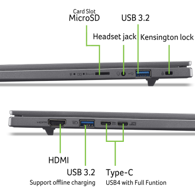 Aspire 16 пропонує широкий набір портів для підключення і слот карти пам’яті MicroSD. Підтримка WiFi 802.11ax та Bluetooth забезпечує швидке та стабільне з’єднання. Ноутбук оснащений інтуїтивними функціями штучного інтелекту, які значно підвищують зручність використання. Технології Acer PurifiedVoice 2.0 та PurifiedView 2.0 покращують якість відеодзвінків, усуваючи фоновий шум і оптимізуючи зображення. Acer LiveArt дозволяє миттєво видаляти фон із зображень, що спрощує редагування контенту.