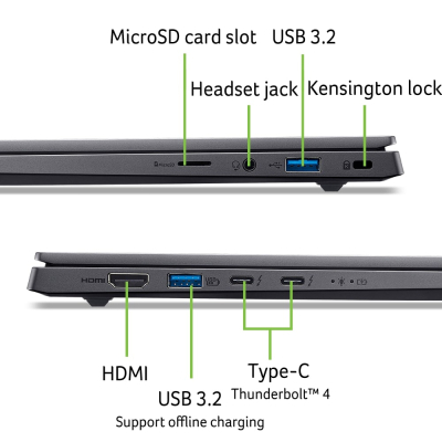 Для підключення та мультимедійних можливостей Swift X 14 пропонує широкий набір інтерфейсів і функцій. Порти USB Type-A і USB4 дозволяють підключати зовнішні монітори чи накопичувачі, а HDMI забезпечує сумісність із сучасними дисплеями. WiFi 802.11ax і стандарт Bluetooth гарантують швидке та стабільне з’єднання.