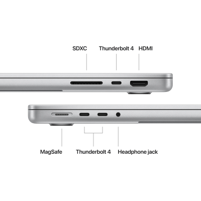 MacBook Pro оснащений потужним набором портів для підключення високошвидкісних периферійних пристроїв, керування дисплеями з високою роздільною здатністю або прямого вивантаження карток SDXC. Він підтримує як Wi-Fi 6E, так і Bluetooth 5.3.
