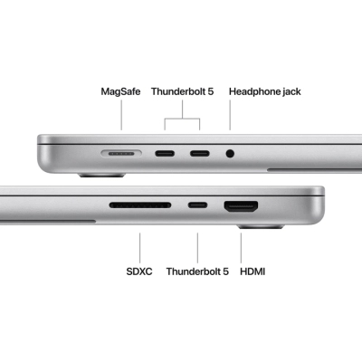 MacBook Pro оснащений набором портів для підключення високошвидкісних периферійних пристроїв, роботи з дисплеями високої роздільної здатності або швидкого копіювання даних із карт SDXC. Моделі з чипом M5 оснащені Thunderbolt 4 і підтримують Wi-Fi 6E та Bluetooth 5.3. Моделі з M5 Pro або M5 Max мають Thunderbolt 5, який забезпечує швидкість передачі даних до 120 Гбіт/с.