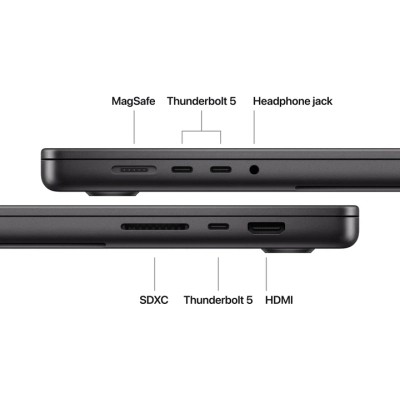 MacBook Pro оснащений набором портів для підключення високошвидкісних периферійних пристроїв, роботи з дисплеями високої роздільної здатності або швидкого копіювання даних із карт SDXC. Моделі з чипом M5 оснащені Thunderbolt 4 і підтримують Wi-Fi 6E та Bluetooth 5.3. Моделі з M5 Pro або M5 Max мають Thunderbolt 5, який забезпечує швидкість передачі даних до 120 Гбіт/с.