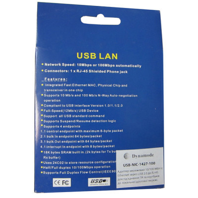 Компактний адаптер локальної мережі з інтерфейсом USB: просто вставте в USB порт і підключіться до мережі патчкорд. Одно- і двосторонній обмін на швидкостях 10 або 100 Мбіт / сек. Підтримка автовизначення швидкості з'єднання. Особливості: чіп: RTL8150. Сумісність з інтерфейсом USB V. 1.0 / 1.1 / 2.0. Роз'єм: RJ-45 Lan Ethernet.