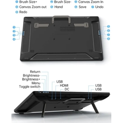 Комплектація: графічний монітор, регульована підставка, перо, 10 наконечників; HDMI кабель, USB кабель, адаптер змінного струму, короткий посібник користувача, серветка для протирання, рукавичка.