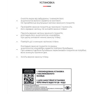 - Очистіть екран від забруднень і знежирте його за допомогою вологої серветки в комплекті. Намагайтеся не торкатися внутрішньої частини захисного покриття.
