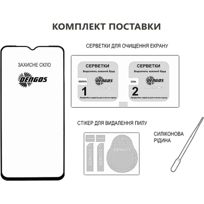Це захисне скло бренду Dengos, модель Full Glue, з артикулом TGFG-416. Воно розроблене для повного прикриття передньої панелі смартфона Redmi 15 і має чорну рамку («Black»).