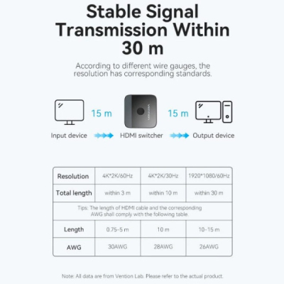Світч Vention HDMI 2.0 забезпечує високу пропускну здатність до 18 Гбіт/с, підтримку 3D, відсутність затримок, відсутність втрати зображення або якості звуку. Просте натискання кнопки для заміни сигналу протягом однієї секунди й світлодіодний індикатор покаже, який порт активний.