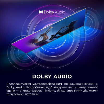 Телеекран оновлюється з частотою 60 Гц, що гарантує плавність динамічних сцен, повертаючи глядачів до самого центру подій. А що ж до звуку? Потужні динаміки на 2 x 8 Вт, оснащені Dolby Audio, додають глибини і реалістичності до будь-якого контенту: чи то серіали, чи то видовищні спортивні події.