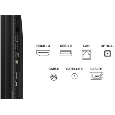 TCL P7K пропонує широкий вибір портів для підключення, включаючи три порти HDMI, два USB-порти, LAN, оптичний аудіовихід, слот CI+, а також входи для супутникового та антенного сигналу. Підтримка Wi-Fi 5 і Bluetooth забезпечує зручне бездротове з’єднання. Це дозволяє легко підключати ігрові консолі, саундбари чи інші пристрої, що робить телевізор універсальним центром розваг.