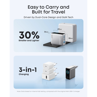 Завдяки складаному штекеру та корпусу, що на 30% менший за аналогічні 100W зарядні пристрої, адаптер легко поміщається в рюкзак, сумку або навіть кишеню куртки. Оптимальне рішення для подорожей, відряджень і мобільного робочого простору.
