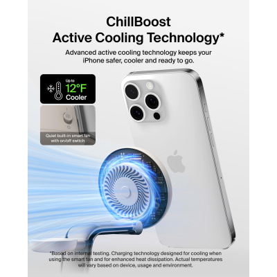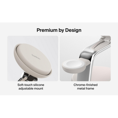 ChillBoost: пасивне охолодження для захисту батареї, підтримання більшості чохлів, преміальні матеріали: хромоване покриття та soft-touch силікон, що гармонійно вписуються в інтер’єр Важка основа для зручного встановлення однією рукою та магнітне кріплення, регульований кут для заряджання за вертикального чи горизонтального режиму