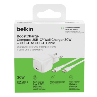 Мережевий зарядний пристрій Belkin 30Вт USB-С PD PPS, кабель USB-С> USB-C, 1м, White (WCA008KQ1MWH-B6)