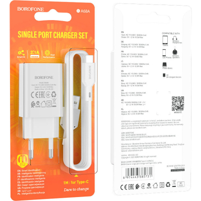 Borofone BA68A Glacier Lightning Type-C White — це зарядка з 1 USB портом, підключити кабель і почати зарядку можна легко. В комплектацію входить кабель Type-C. Головні особливості комплектації та конструкції представленої моделі — це зарядка зі знімним кабелем.