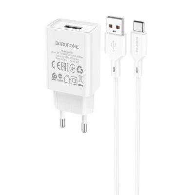 BOROFONE BA68A — це простий мережевий зарядний пристрій білого кольору потужністю 10.5 Вт. Має один USB‑A порт (5V/2.1A) і в комплекті йде кабель USB-A → USB-C довжиною 1 м. Підходить для базового заряджання смартфонів та інших гаджетів без підтримки швидкої зарядки.