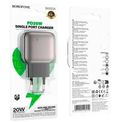 Borofone BAS53A Absolute Single-Port PD20W Charger Set (C to C) (EU) Black — це надійний та ефективний вибір для швидкого заряджання ваших гаджетів у будь-яких умовах. Підтримка швидкої зарядки для смартфонів, планшетів, ноутбуків та інших пристроїв із роз'ємом Type-C.