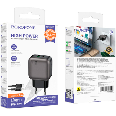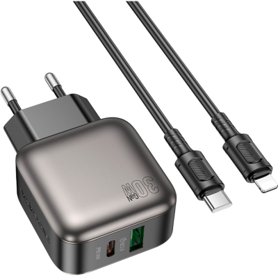 Мережевий зарядний пристрій Borofone BAS55A Absolute PD30W + QC3.0 Charger Set (C to iP) (EU) Black – це компактний і надійний зарядний пристрій, який забезпечує швидку зарядку для пристроїв із роз'ємом Lightning. Оснащений портом USB-C і USB-A, підтримує технології Power Delivery (PD) 30 Вт та Quick Charge 3.0. У комплект входить кабель Type-C to Lightning, що ідеально підходить для користувачів iPhone, iPad та інших пристроїв Apple.