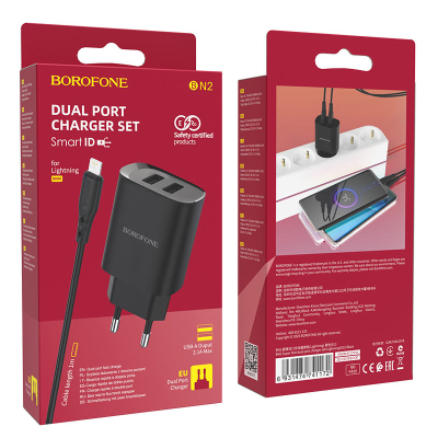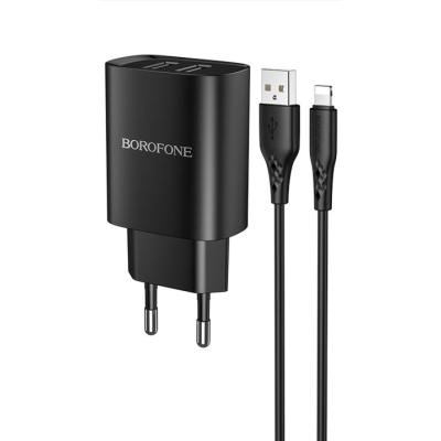 Borofone BN2 Super Fast 2.1a 2xUSB-A ports charger + Lightning cable — це зарядний пристрій для для телефона, для планшета, для Apple AirPods. Модель забезпечить відповідну потужність і силу струму, допоможе якомога довше зберегти працездатність вбудованої батареї і зарядку за мінімальний час. У разі необхідності його можна використовувати і для інших приладів, єдине — враховуйте сумісність портів і потужність енергії.