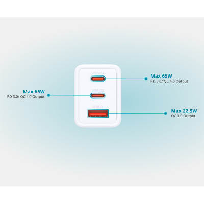 Зарядний пристрій D-Link DCP-651 – це компактний мережевий адаптер потужністю 65 Вт із двома портами USB-C та одним USB-A. Обидва USB-C забезпечують потужність до 65 Вт, а USB-A – до 22,5 Вт. Завдяки технології GaN він працює ефективніше та виділяє менше тепла. Пристрій має багаторівневий захист від перенапруги, надструму, перегріву, перезаряду та короткого замикання.