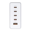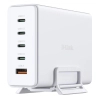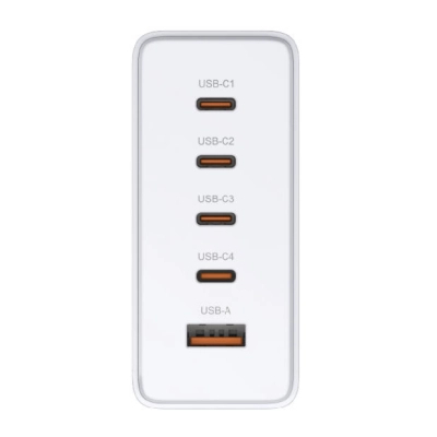 Компактний зарядний пристрій з технологією GaN забезпечує потужність до 240 W для одночасного заряджання до 5 пристроїв. Оснащений чотирма портами USB-C і одним USB-A, має інтелектуальну систему розподілу потужності та підтримує стандарти PD 3.1 і QC 4.0. До комплекту входить зручна підставка. Є захист від перегріву, перенапруги, короткого замикання та перезаряду.