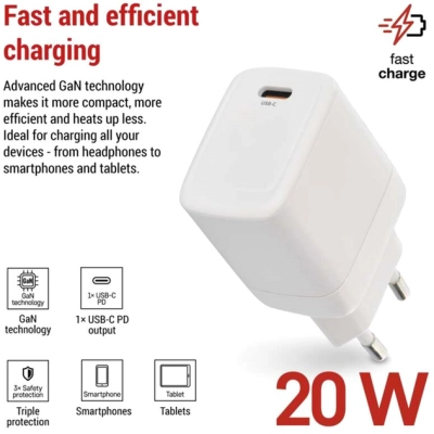 Універсальний USB-зарядний пристрій V01G20 від чеського виробника Emos — це простий і надійний мережевий адаптер із виходом USB-C для швидкого заряджання, виготовлений за технологією GaN (нітрид галію). Цей інноваційний матеріал замінює класичні кремнієві напівпровідники, забезпечуючи вищу ефективність, менше нагрівання та компактніший розмір. Ви отримуєте адаптер, який потужніший, компактніший та енергоефективніший за звичайні зарядні пристрої. Крім того, він сумісний майже з усіма розетками в Європі, що робить його ідеальним супутником у подорожах.