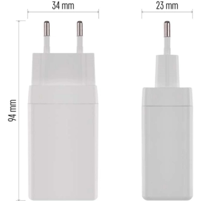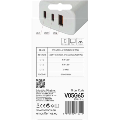 Універсальний USB-зарядний пристрій V05G65 від чеського виробника Emos — це простий і надійний мережевий адаптер із виходами USB-A та 2× USB-C для швидкого заряджання, виготовлений за технологією GaN (нітрид галію). Цей інноваційний матеріал замінює класичні кремнієві напівпровідники, забезпечуючи вищу ефективність, менше нагрівання та компактніший розмір. Ви отримуєте адаптер, який потужніший, компактніший та енергоефективніший за звичайні зарядні пристрої. Крім того, він сумісний майже з усіма розетками в Європі, що робить його ідеальним супутником у подорожах.